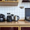 Dal salone, proseguendo all'interno, troverete la cucina completamente attrezzata, completa di una pratica penisola dove poter gustare la vostra colazione con vista mare. Troverete tutto il necessario, dalla lavastoviglie al forno, incluso macchina del caffè, bollitore e tostapane, per rendere il vostro soggiorno il più confortevole possibile.