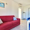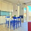 Il soggiorno, con un tavolo da pranzo per quattro persone e un comodissimo divano letto, offre una vista spettacolare attraverso la porta finestra che conduce al terrazzo privato.