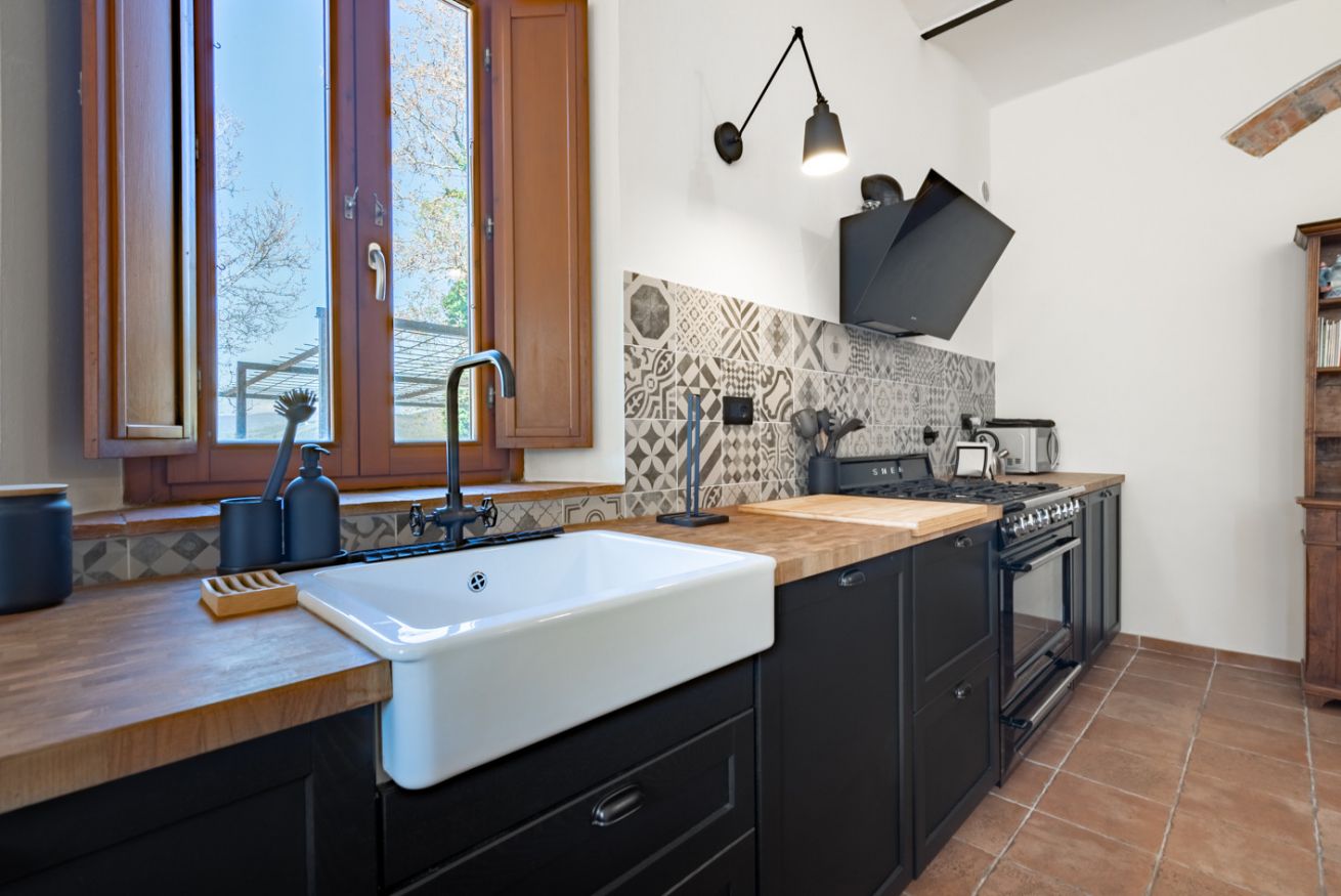 La cucina, completamente attrezzata con elettrodomestici moderni, offre la possibilità di preparare deliziose pietanze utilizzando i prodotti locali freschi reperibili nelle vicine botteghe e mercati. A disposizione il piano cottura, il forno, la lavastoviglie, il bollitore, il tostapane, il frigorifero con funzione freezer ed un set completo per gli ospiti (utensili, pentole, padelle, posate, piatti, bicchieri, tazze, tazzine).