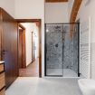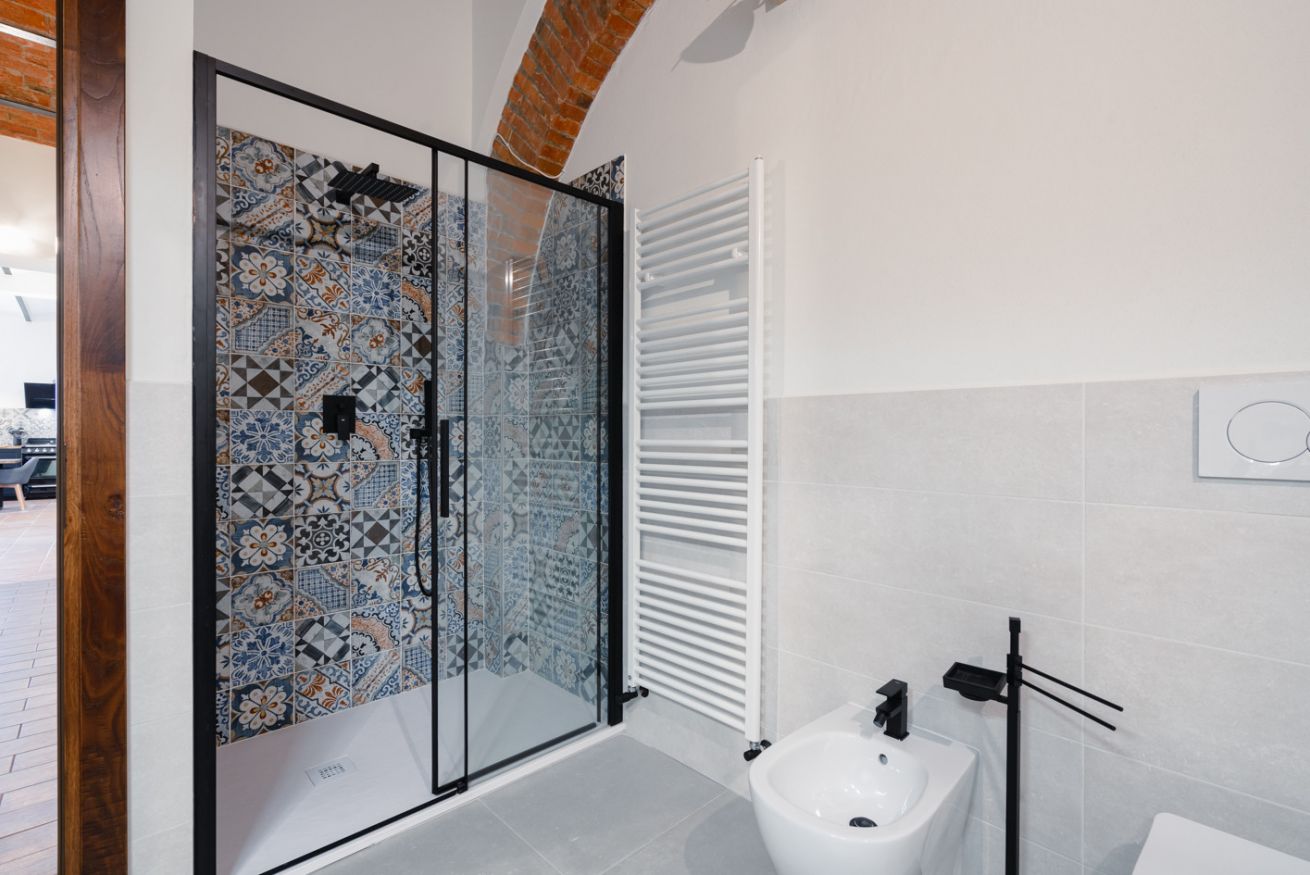 Il Bagno completamente ristrutturato dispone di un’ampia cabina doccia, un elegante lavabo, sanitari completi, asciugacapelli e dispenser con sapone per le mani.