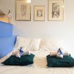 Il mobile letto, creato appositamente su misura, diventa un punto focale dell'ambiente. Dipinto di un delicato blu, richiamando i colori del mare, si fonde armoniosamente con l'ambiente circostante. Di giorno, il letto matrimoniale alla francese può essere facilmente trasformato in uno spazioso divano per rilassarsi o intrattenersi con gli amici grazie a due enormi cuscini ideati appositamente per la struttura. Di notte, si trasforma in un accogliente rifugio per un sonno tranquillo.