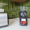 Adiacente alla zona living troverete la cucina, essa dispone di tutto il necessario, frigorifero, fornelli, forno, lavastoviglie, bollitore, tostapane, macchina del caffè Nespresso con relative cialde ed un set completo di pentole e posateria, comprende anche un tavolo con sedie per tutti gli ospiti ideale per consumare colazioni pranzi o cene gustando le tipicità locali, in aggiunta dispone anche di un balcone esterno.