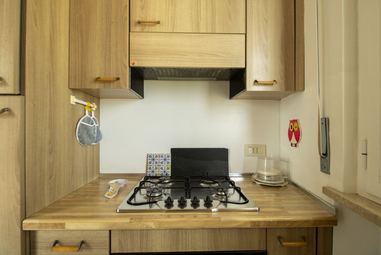 All'ingresso vi accoglie una cucina-soggiorno completamente accessoriata: fornelli, forno, frigorifero con congelatore, macchina Nespresso, tostapane, bollitore e un kit completo di stoviglie e pentole.